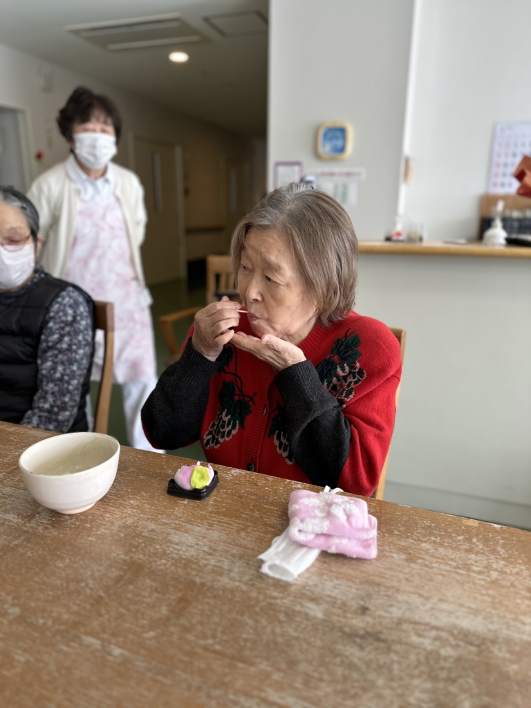 入居者の皆さんは、抹茶と上生菓子のセットを喜んで召し上がっておられました。